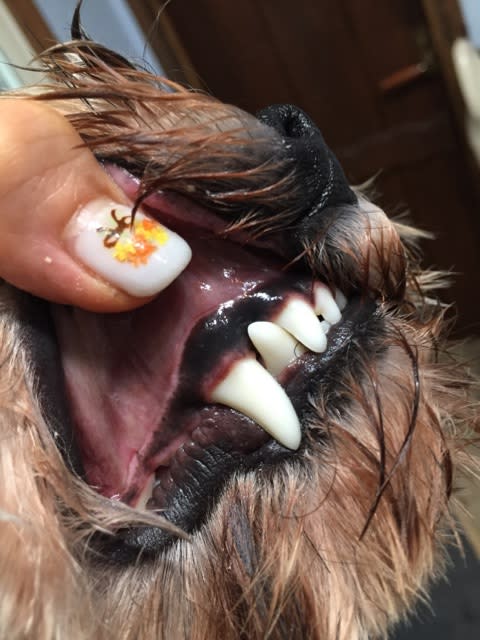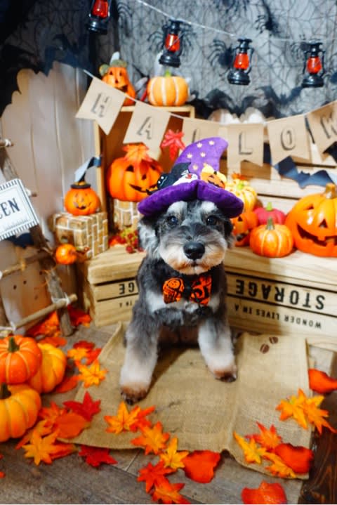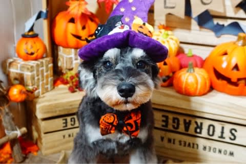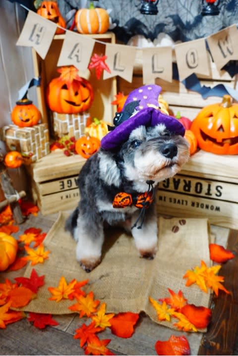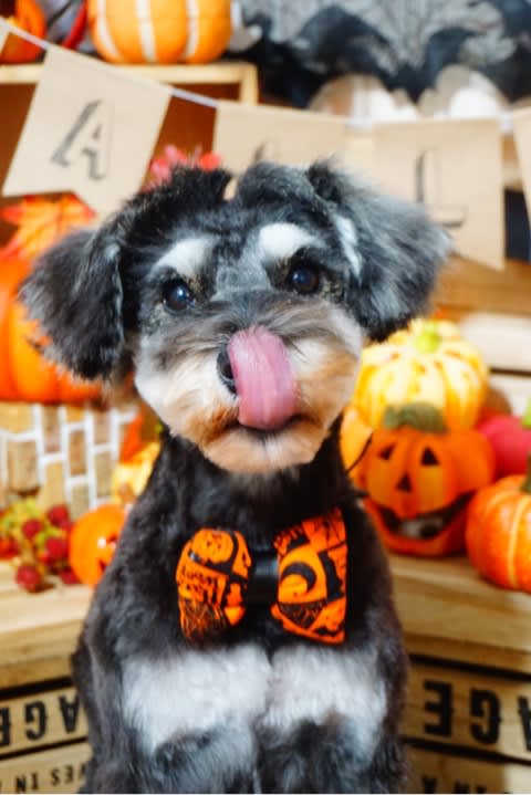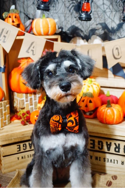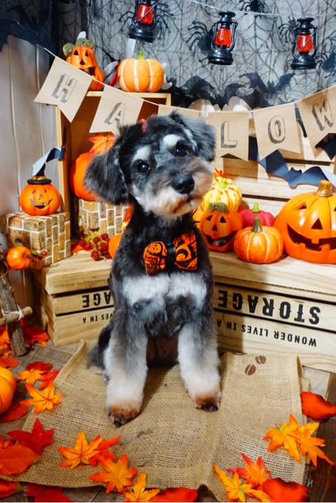 プードルちゃんのトップノットでは、毛がふんわりしているため、ハロウィンリボンが付けられないのですが、ストレートヘアーのトップノットちゃんには、頭もハロウィ〜ん